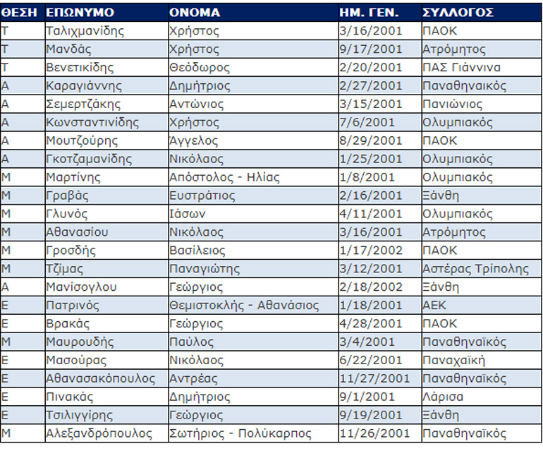 Είκοσι τρεις ποδοσφαιριστές κάλεσε ο Βασίλης Γεωργόπουλος για προπονήσεις με την Εθνική Παίδων και φιλικό αγώνα με την Κ-17 του Ατρόμητου στις 13 Δεκεμβρίου και ώρα 11.00 στις αθλητικές εγκαταστάσεις του Αγίου Κοσμά.