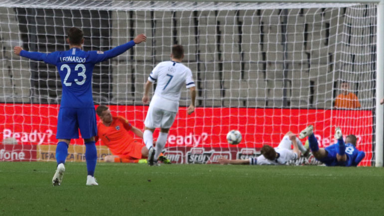 Στο 25ο λεπτό η διάθεση της ελληνικής ομάδας ανταμείφθηκε: ο Τοροσίδης έκανε την ατομική προσπάθεια και τη σέντρα από δεξιά, ο Πέλκας με όλη την εστία μπροστά του έστειλε την μπάλα με κεφαλιά στα… πόδια του Χραντέτσκι, αλλά στην επαναφορά τη βρήκε ο Γκράνλουντ και την έστειλε στα δίχτυα για το 1-0, στο πρώτο τέρμα που δέχθηκε η Φινλανδία στο Nations League.