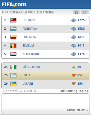Η Εθνική ομάδα ποδοσφαίρου έχασε πολύ έδαφος στην Παγκόσμια Κατάταξη της FIFA. Η Ελλάδα μετά τις συνεχείς ήττες στα προκριματικά του Euro 2016 υποχώρησε στην 25η θέση πέφτοντας επτά «σκαλοπάτια» σε σχέση με τον προηγούμενο μήνα!