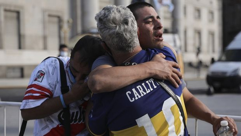 Ο Θεός του ποδοσφαίρου κατάφερε να ενώσει μέχρι και ορκισμένους «εχθρούς», καθώς οι οπαδοί των Μπόκα Τζούνιορς και Ρίβερ Πλέιτ θρηνούν αγκαλιασμένοι με δάκρυα στα μάτια.