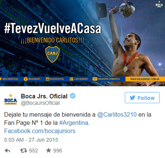 «Η επιστροφή του Κάρλος Τέβες, την ώρα μάλιστα που διανύει μια εξαιρετική στιγμή της καριέρας του, είναι μια φανταστική είδηση για όλα τα μέλη και τους υποστηρικτές της Μπόκα, αλλά και για ολόκληρο το ποδόσφαιρο της Αργεντινής. Η άφιξη του Κάρλος θα επιτρέψει ένα μεγάλο άλμα ποιότητας στη μεγάλη ομάδα που ήδη διαθέτουμε» πρόσθεσε ο πρόεδρος.