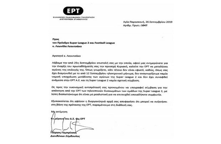Η Super League 2 απάντησε την Τετάρτη (25/09) στην πρόταση της ΕΡΤ για τη μείωση 60%, αντιπροτείνοντας μείωση 20% για τους «9» και 12% για τις ΠΑΕ που υποβιβάστηκαν από τη Super League 1.