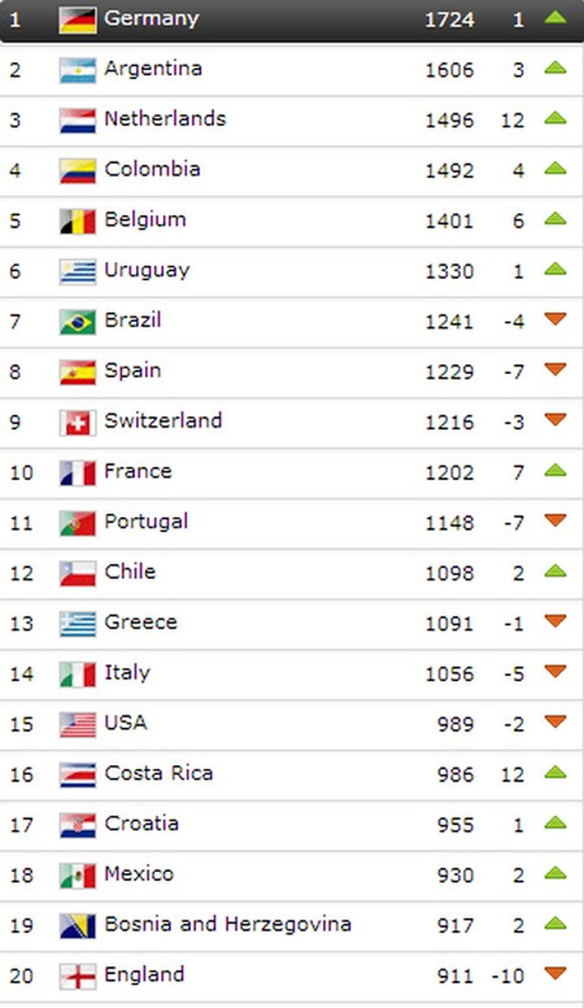 Στην κορυφή της σχετικής κατάταξης βρίσκεται η παγκόσμια πρωταθλήτρια Γερμανία ενώ η φιναλίστ Αργεντινή «σκαρφάλωσε» στην 2η θέση.