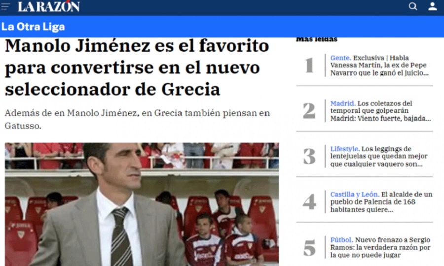 «Ο Μανόλο Χιμένεθ είναι το φαβορί για να γίνει ο νέος προπονητής της Ελλάδας», είναι ο τίτλος στο δημοσίευμα, ενώ στο σχετικό ρεπορτάζ αναφέρεται πως εκτός από τον Χιμένεθ, στην ελληνική ομοσπονδία έχει προταθεί και Τζενάρο Γκατούζο.