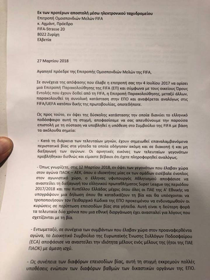 Στην επιστολή του Χούμπελ μεταξύ άλλων γίνεται αναφορά στα περιστατικά βίας που «προβλήθηκαν διεθνώς», στα γεγονότα του ντέρμπι ΠΑΟΚ-ΑΕΚ, στη διακοπή του πρωταθλήματος, στη διαγραφή του ΠΑΟΚ από την ECA, στις δικαστικές υποθέσεις που καθυστερούν, στην πεποίθηση ότι το πρωτάθλημα θα κριθεί στις δικαστικές αίθουσες κι όχι στον αγωνιστικό χώρο, και στις συστάσεις της «Επιτροπής Παρακολούθησης» προς την ΕΠΟ που δεν υλοποιήθηκαν.