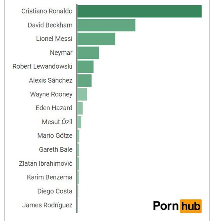 Το Pornhup δημοσίευσε τη λίστα με τους 15 ποδοσφαιριστές που είναι αυτοί με τη μεγαλύτερη ζήτηση από τους επισκέπτες της πορνογραφικής ιστοσελίδας και πρώτος με διαφορά είναι ο Κριστιάνο Ρονάλντο, ενώ δεύτερος αν και παλαίμαχος είναι ο Ντέιβιντ Μπέκαμ.