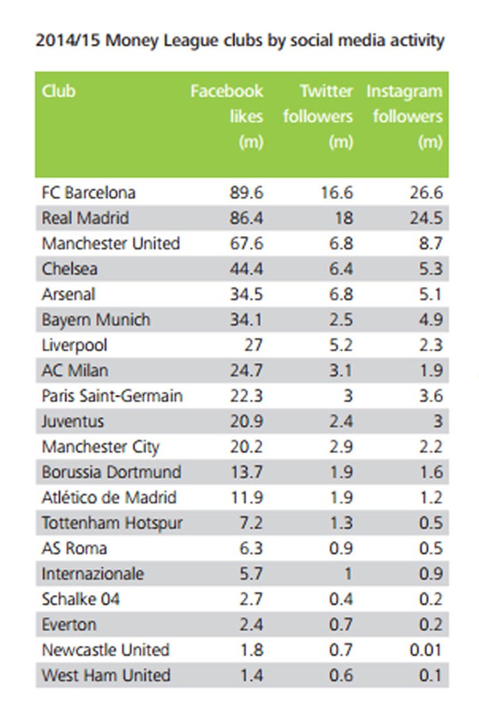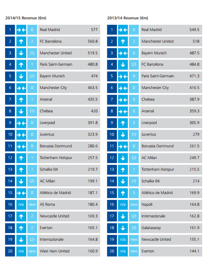 Οι Μαδριλένοι «έκλεισαν» με έσοδα την σεζόν 2014-15 να φτάνουν τα 577 εκατ. ευρώ, ενώ ακολουθεί η Μπαρτσελόνα με 560,8 εκατ. ευρώ. Στην τρίτη θέση για αλλη μια χρονιά είναι η Μάντσεστερ Γιουνάιτετ με 519,5 εκατ. ευρώ.
