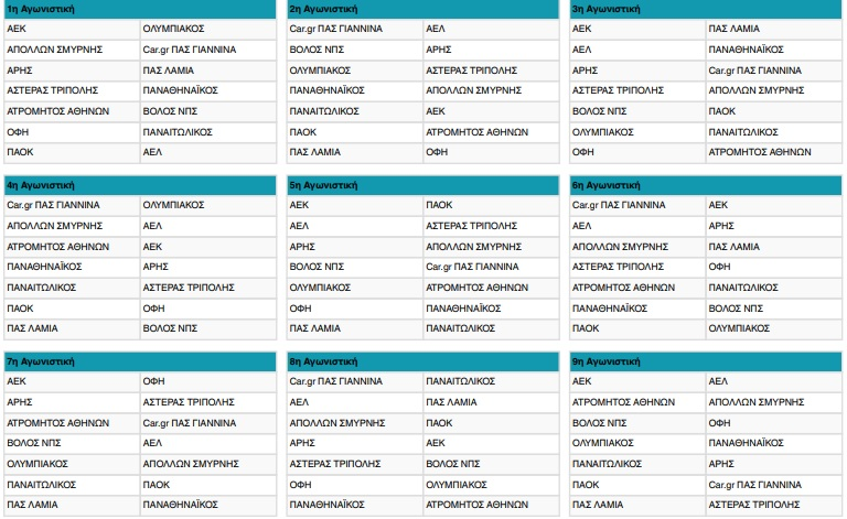Ο Απόλλωνας Σμύρνης, που προέρχεται από τα πρόσφατα παιχνίδια-μπαράζ με την Ξάνθη, δεν θα αγωνιστεί στις τρεις πρώτες αγωνιστικές και ο ΠΑΣ Γιάννινα στις δύο, γι΄ αυτό και ορίστηκε να παίξουν μεταξύ τους την πρώτη αγωνιστική.