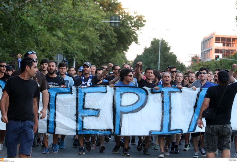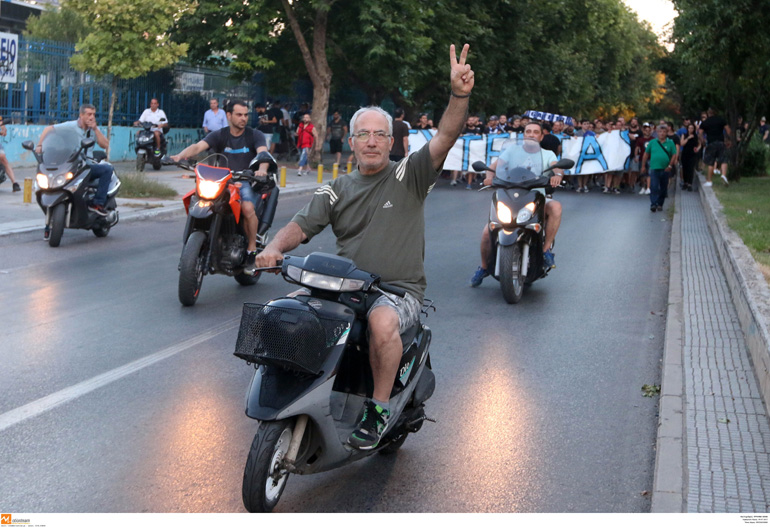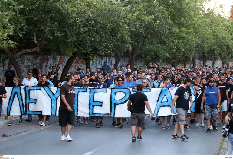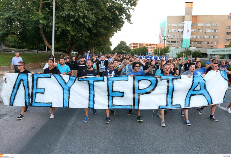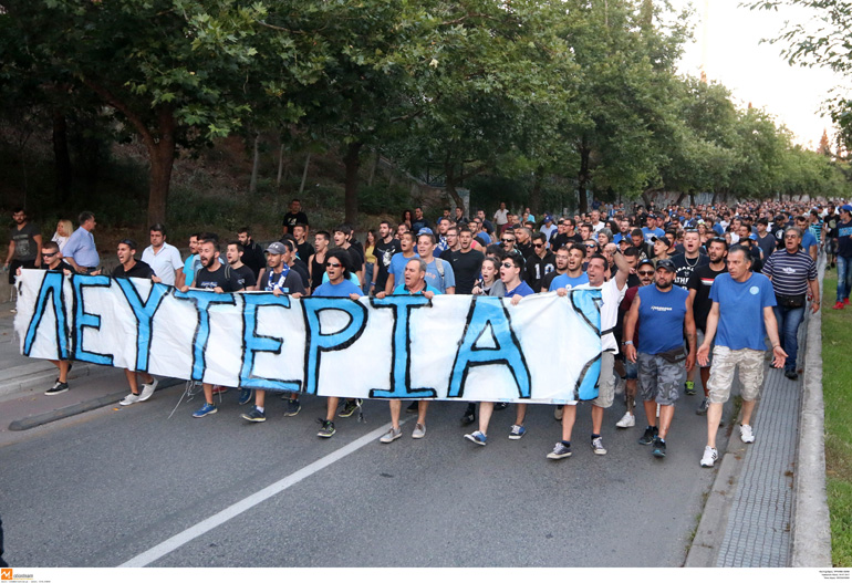 Οι φίλοι του «Γηραιού» φώναξαν συνθήματα κατά της διοίκησης αλλά και της πολιτείας και κρατούσαν πανό που έγραφε «Λευτεριά στον Ηρακλή».