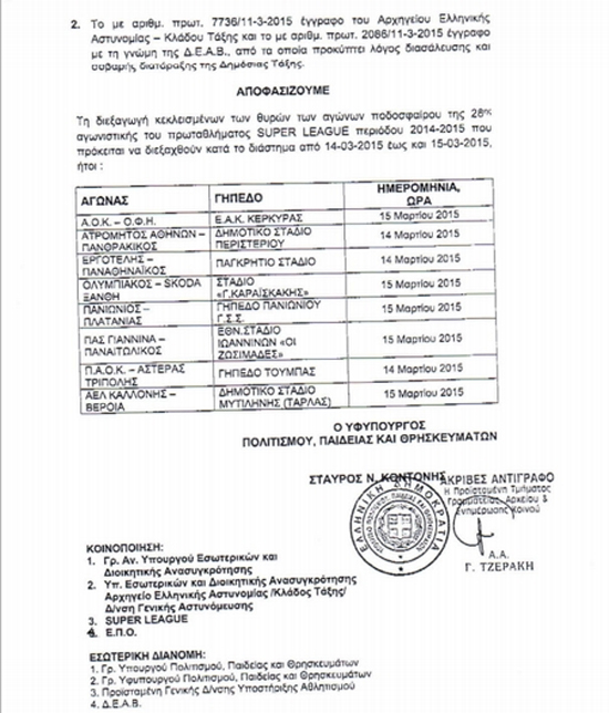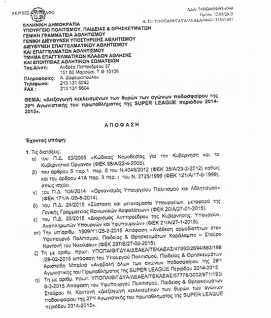 «Ανακοινώνεται ότι η 28η Αγωνιστική του Πρωταθλήματος Super League ΟΠΑΠ (14 & 15 Μαρτίου 2015) θα πραγματοποιηθεί κεκλεισμένων των θυρών, σύμφωνα με απόφαση του υφυπουργού Πολιτισμού, Παιδείας και Θρησκευμάτων, κ. Στ. Κοντονή».