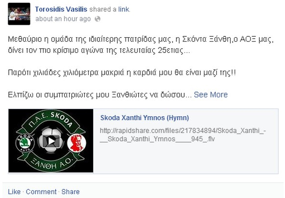 «Μεθαύριο η ομάδα της ιδιαίτερης πατρίδας μας, η Σκόντα Ξάνθη,ο ΑΟΞ μας, δίνει τον πιο κρίσιμο αγώνα της τελευταίας 25ετιας…