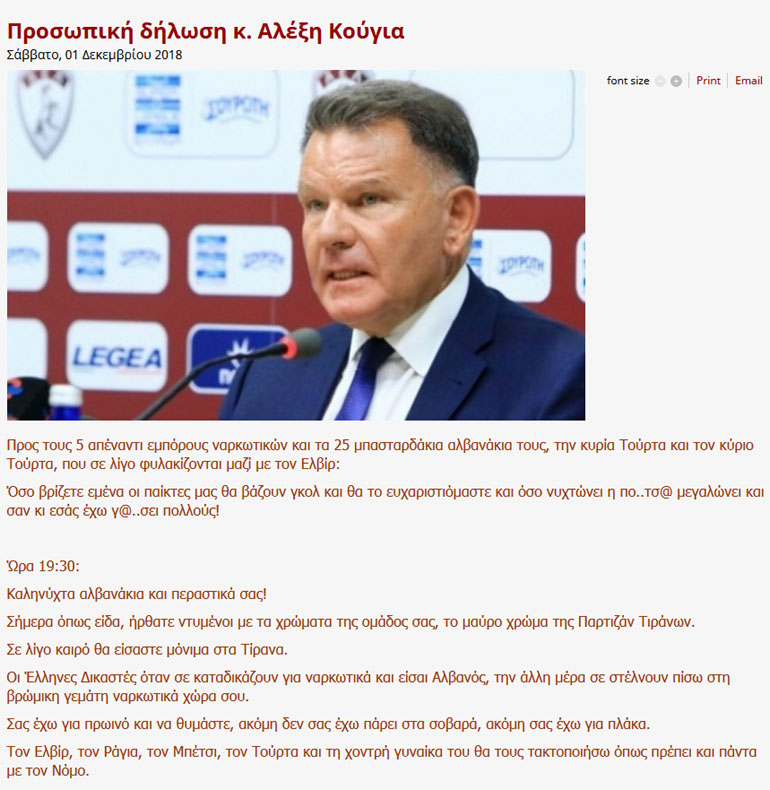 Πάντως πριν την ολοκλήρωση του παιχνιδιού ο Αλέξης Κούγιας, ο κατά δήλωσή του καλύτερος ποινικολόγος της χώρας, προχώρησε σε μία άνευ προηγουμένου γραπτή δήλωση, με εκφράσεις… πεζοδρομίου, η οποία μάλιστα αναρτήθηκε στην επίσημη ιστοσελίδα της ομάδας.