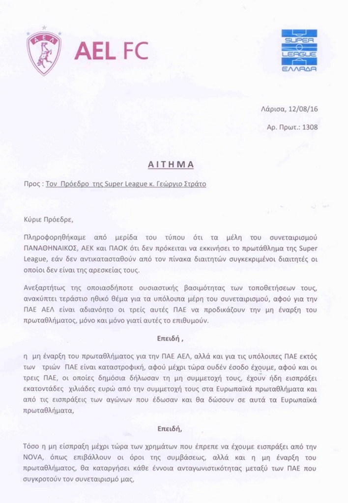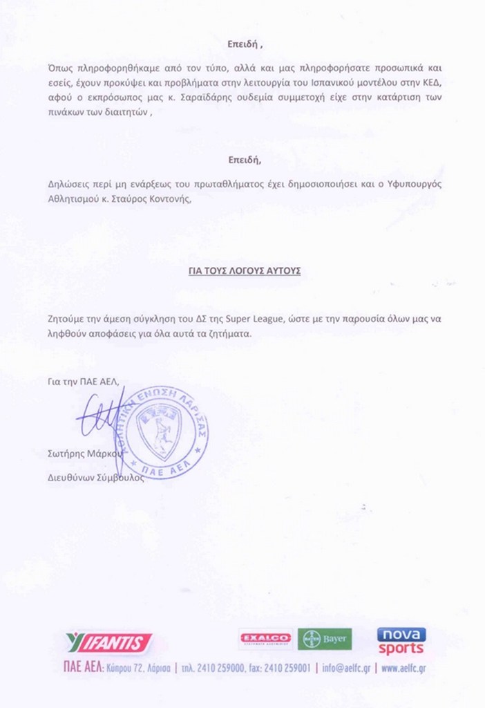 Η Λάρισε με επιστολή της προς τον πρόεδρο της Super League, Γιώργο Στράτο, η ΠΑΕ ΑΕΛ τονίζει πως είναι αδιανόητο τρεις ομάδες να προδικάζουν τη μη έναρξη του πρωταθλήματος και ζητάει άμεσα σύγκληση του Δ.Σ. της Λίγκας προκειμένου να ληφθούν αποφάσεις.