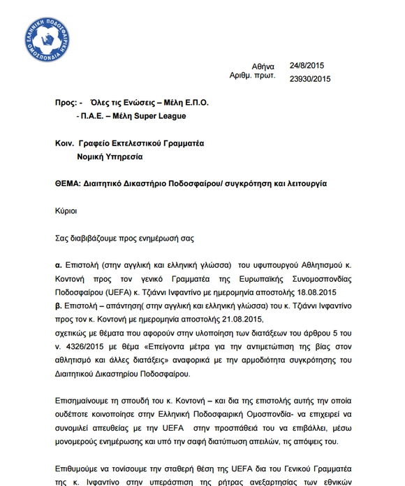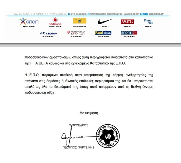Η ΕΠΟ υπογραμμίζει στο κείμενο που συνέταξε τη θέση της Ευρωπαϊκής Ομοσπονδίας για την «ανεξαρτησία» των ποδοσφαιρικών ομοσπονδιών και αναφέρει: «Επιχειρεί να συνομιλεί απευθείας με την UEFA, στην προσπάθειά του να επιβάλει τις απόψεις του».
