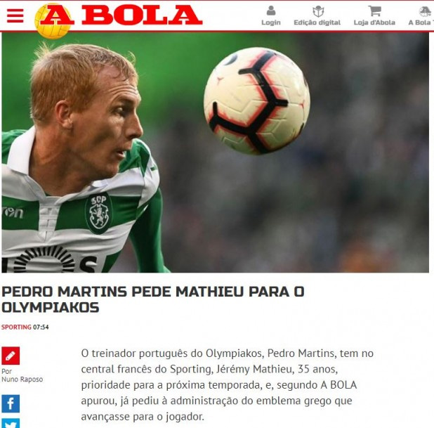 Πιο συγκεκριμένα το πορτογαλικό Μέσο στον τίτλο του ρεπορτάζ του αναφέρει ότι «… ο Μαρτίνς έχει ζητήσει τον Ματιέ στον Ολυμπιακό», τονίζοντας παράλληλα ότι ο Γάλλος στόπερ φιγουράρει στην κορυφή της λίστας του τεχνικού των Πειραιωτών για αυτή τη θέση.