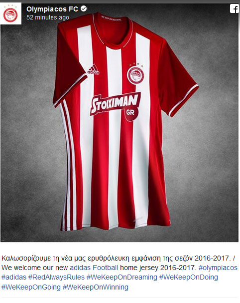 Tη νέα του φανέλα που θα φοράει την αγωνιστική περιόδο 2016-17 παρουσίασε την Παρασκευή ο Ολυμπιακός.