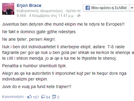 Επτά – οκτώ φοβερές ευκαιρίες για γκολ που δεν έγιναν γκολ οφείλεται στο γεγονός ότι θέλει να σκοράρει αυτός που θέλει να σκοράρει, και όχι αυτός που μπορεί να σκοράρει το πέναλτι για παράδειγμα. Η Γιουβέντους θα τον ανεχτεί για πολύ ακόμα αυτόν τον προπονητή;», ανέφερε στο ποστ του ο Μπράτσε, ο οποίος είναι και στενός φίλος του πρωθυπουργού της χώρας Έντι Ράμα.