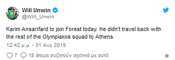 Στην ανάρτησή το ο Ουίλ Άνγουϊν αναφέρει ότι ο Ανσαριφάρντ θα ενταχθεί σήμερα στο ρόστερ της νέας του ομάδας, προσθέτοντας μάλιστα ότι δεν ακολούθησε την υπόλοιπη αποστολή του Ολυμπιακού, που επέστρεψε από την Αγγλία μετά την αναμέτρηση κόντρα στην Μπέρνλι, προκειμένου να ολοκληρωθεί η μετακίνησή του στη Φόρεστ.
