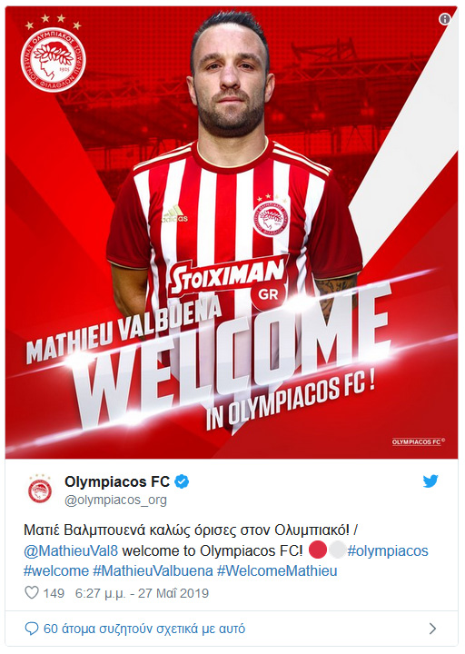 Λίγες ώρες αργότερα ήρθε και η ανάρτηση του Ολυμπιακού στο Twtter μέσω της οποίας ανακοινώνει την απόκτηση του παίκτη.