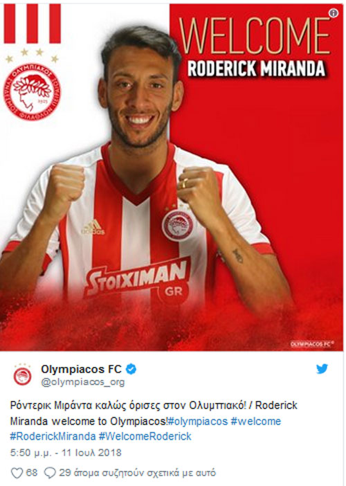 Παίκτης του Ολυμπιακού είναι κι επίσημα πλέον ο Ρόντερικ Μιράντα, καθώς οι ερυθρόλευκοι ανακοίνωσαν την οριστική συμφωνία τους με τον παίκτη.
