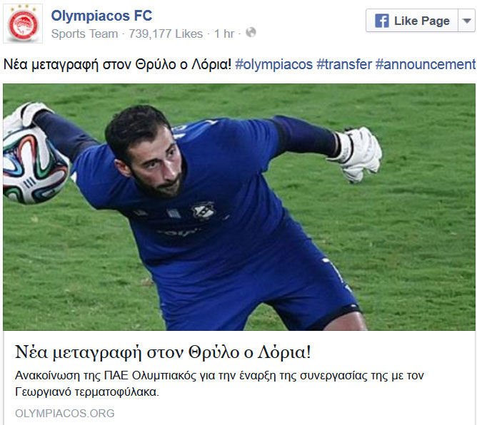 «Η ΠΑΕ Ολυμπιακός ανακοινώνει την απόκτηση του Γεωργιανού τερματοφύλακα Γκιόργκι Λόρια.