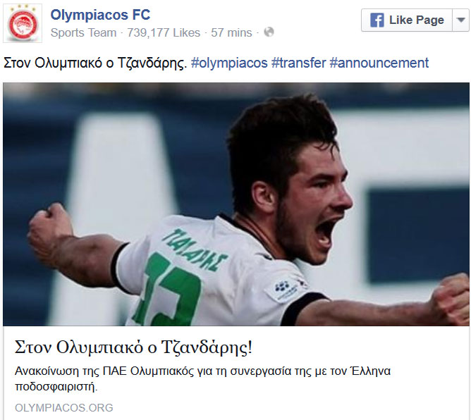 «Η ΠΑΕ Ολυμπιακός ανακοινώνει την απόκτηση του ποδοσφαιριστή Φάνη Τζανδάρη.