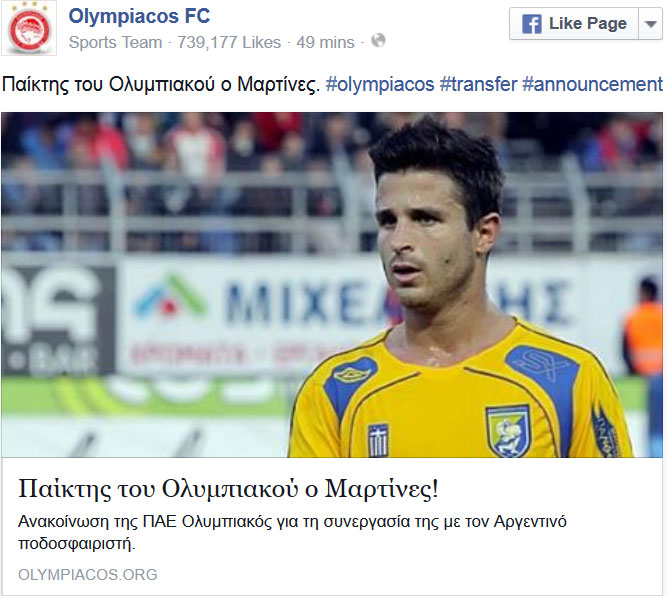 «Η ΠΑΕ Ολυμπιακός ανακοινώνει την απόκτηση του ποδοσφαιριστή Νικολάς Μαρτίνες.