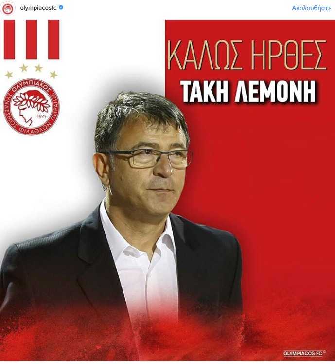 Η ΠΑΕ Ολυμπιακός ανακοινώνει την έναρξη της συνεργασίας της με τον κ. Τάκη Λεμονή, ο οποίος αναλαμβάνει τη θέση του προπονητή.