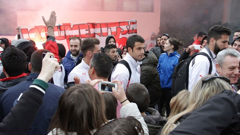 Οι «ερυθρόλευκοι», οι οποίοι απέναντι στον «Άγιαξ» της Ηπείρου θα ψάξουν τη νίκη, για τον τίτλο, έτυχαν θερμής υποδοχής από 200 περίπου φιλάθλους τους, που είχαν μετατρέψει σε ένα μικρό «Καραϊσκάκη» το αεροδρόμιο της πόλης.