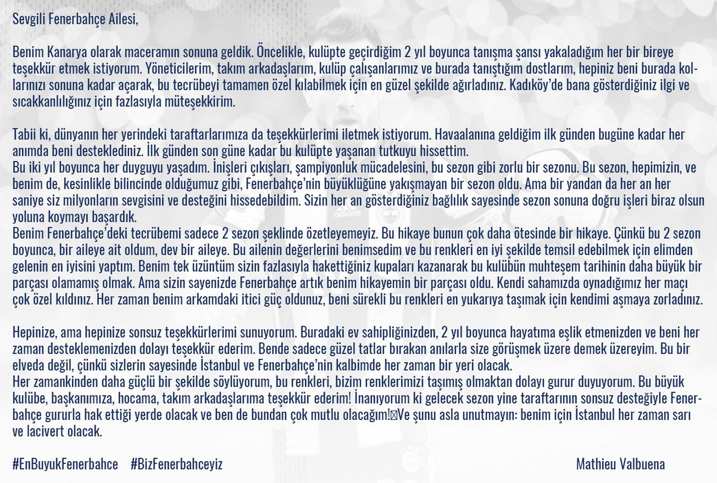 Θα είμαι ευγνώμων σε όλους σας για πάντα. Σας ευχαριστώ για τη θερμή υποδοχή, σας ευχαριστώ που σταθήκατε στο πλάι μου κατά τη διάρκεια αυτών των δύο ετών, σας ευχαριστώ που με υποστηρίζετε πάντα. Δεν πικραίνομαι για το αντίο που θα σας πω. Δεν είναι αντίο. Χάρη σε εσάς η Κωνσταντινούπολη και η Φενέρ θα έχει πάντα μια θέση στην καρδιά μου.