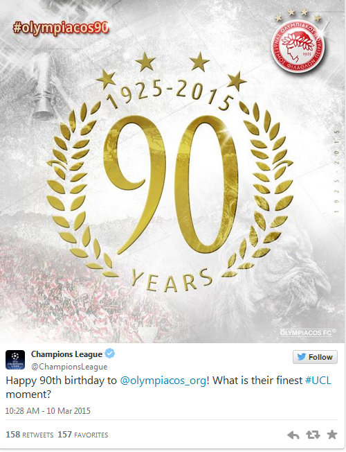 Η FIFA και η UEFA μέσω των social media ευχήθηκαν χρόνια πολλά στον Ολυμπιακό με αφορμή την συμπλήρωση των 90 ετών από την ίδρυσή του! Δείτε τα «tweets» της Παγκόσμιας και της Ευρωπαϊκής Ομοσπονδίας Ποδοσφαίρου: