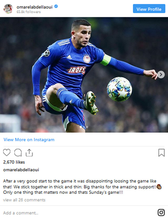 Την απογοήτευσή του για την εξέλιξη που είχε ο αγώνας του Ολυμπιακού με την Τότεναμ εξέφρασε σε ποστάρισμά του στο instagram ο Ομάρ Ελαμπντελαουί, ο οποίος παράλληλα επισήμανε ότι η ομάδα του πλέον επικεντρώνεται στο ντέρμπι κορυφής με τον ΠΑΟΚ.