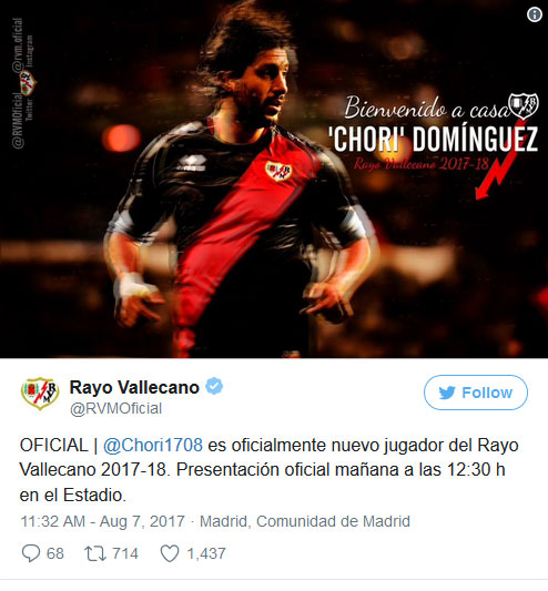 «Ο Αλεχάντρο «Τσόρι» Ντομίνγκες είναι επίσημα παίκτης της Ράγιο Βαγιεκάνο για τη σεζόν 2017-18», αναφέρεται στην ανακοίνωση της ισπανικής ομάδας.