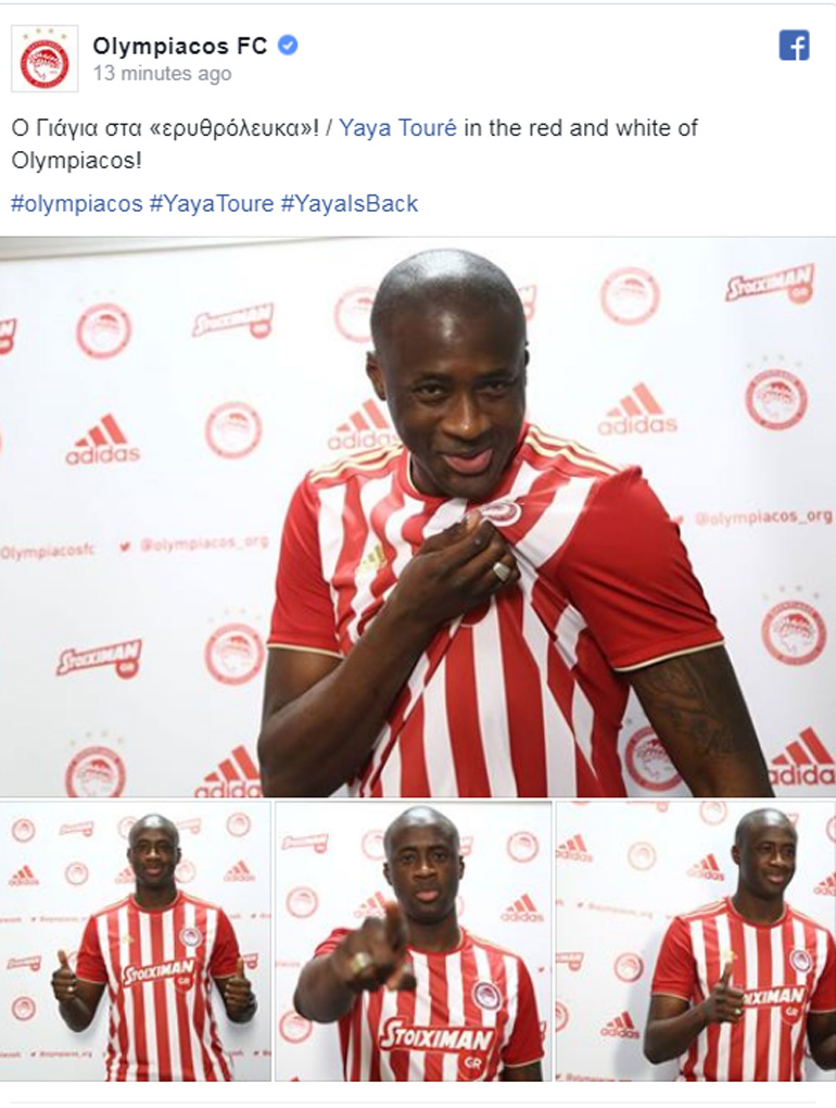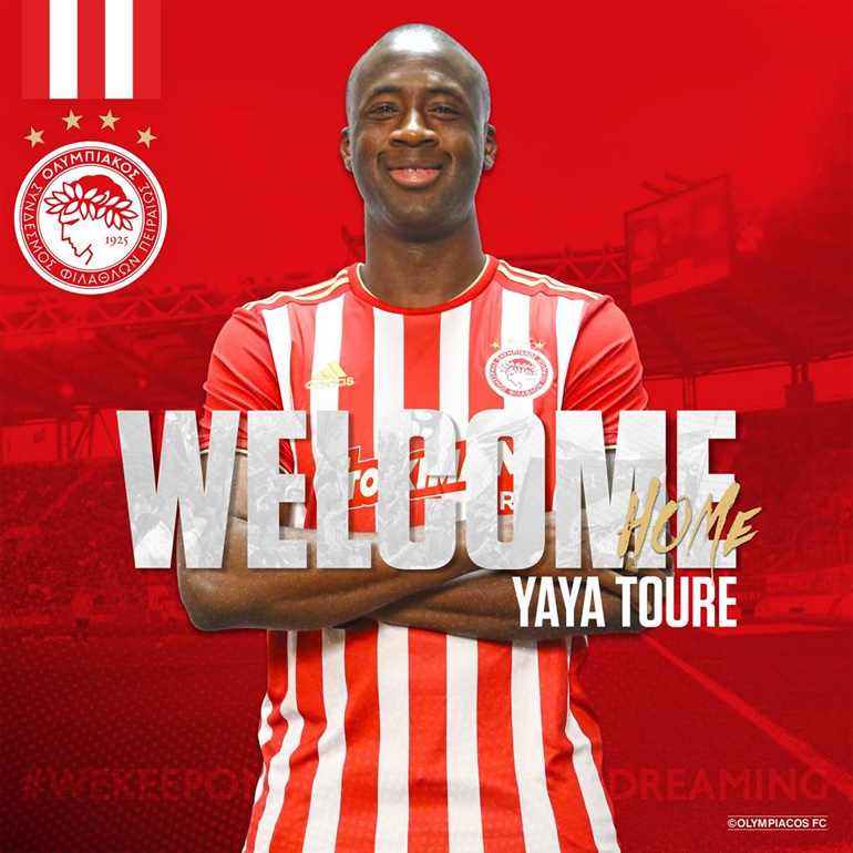 Την απόκτηση του Γιάγια Τουρέ ανακοίνωσε ο Ολυμπιακός μέσα από τους λογαριασμούς στα social media. Ο Ιβαριανός μέσος υπέγραψε το συμβόλαιό του και παρακολούθησε το παιχνίδι απέναντι στον ΠΑΣ Γιάννινα, ενώ χειροκροτήθηκε από τον κόσμο τόσο στα γραφεία των Πειραιωτών, όσο και στο «Γ. Καραϊσκάκης».