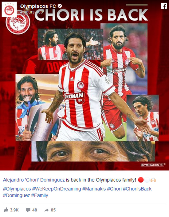 «Η ΠΑΕ Ολυμπιακός ανακοινώνει την έναρξη της συνεργασίας της με τον Αλεχάντρο «Τσόρι» Ντομίνγκες, o οποίος θα ενταχθεί στο τεχνικό τμήμα και το τμήμα σκάουτινγκ. Τσόρι, καλώς όρισες και πάλι στην οικογένεια του Ολυμπιακού!».
