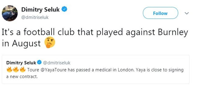 Πιο συγκεκριμένα ο Ουκρανός μάνατζερ, ερωτηθείς στο twitter, για το που θα συνεχίσει την καριέρα του ο πρώην παίκτης των Μπαρτσελόνα και Σίτι, ανέφερε με νόημα: «Είναι ένας σύλλογος που έπαιξε κόντρα στην Μπέρνλι τον Αύγουστο».