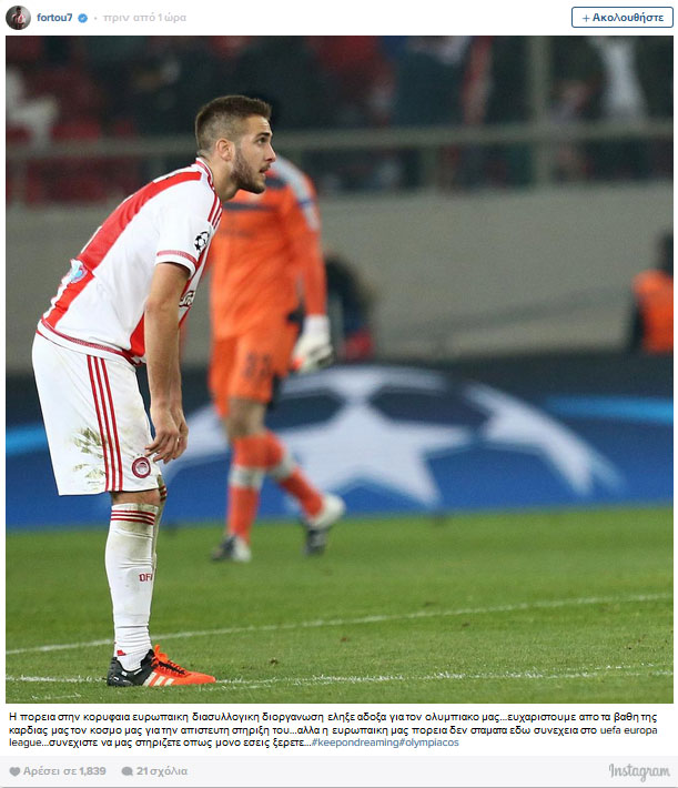 «Η πορεία στην κορυφαία ευρωπαϊκή διασυλλογική διοργάνωση έληξε άδοξα για τον Ολυμπιακό μας… Ευχαριστούμε από τα βάθη της καρδιάς μας τον κόσμο μας για την απίστευτη στήριξη του, αλλά η ευρωπαϊκή μας πορεία δεν σταματά εδώ συνέχεια στο Europa League. Συνεχίστε να μας στηρίζετε όπως μόνο εσείς ξέρετε. Συνεχίζουμε να ονειρευόμαστε», ανέφερε ο Φορτούνης.