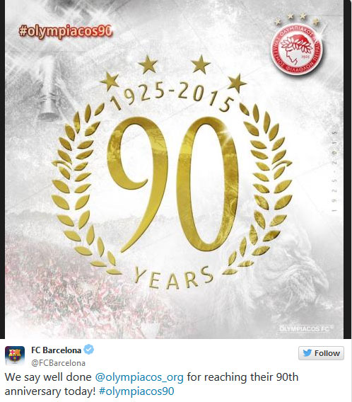Ο λόγος για την Μπαρτσελόνα, η οποία σε τιτίβισμά της ανέφερε για τα γενέθλια των Πειραιωτών «Λέμε συγχαρητήρια στον Ολυμπιακό για την 90ή επέτειό του σήμερα».