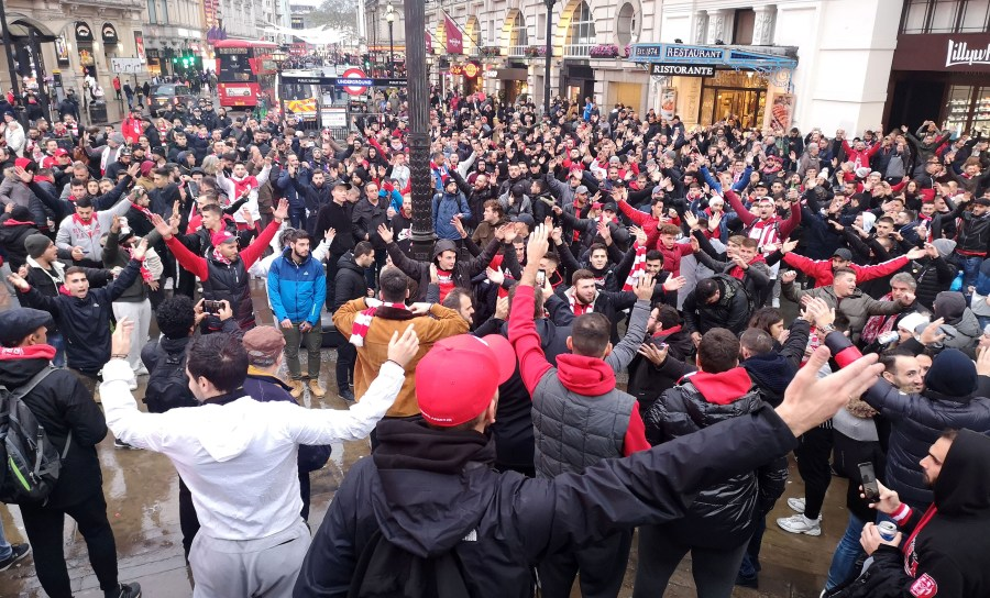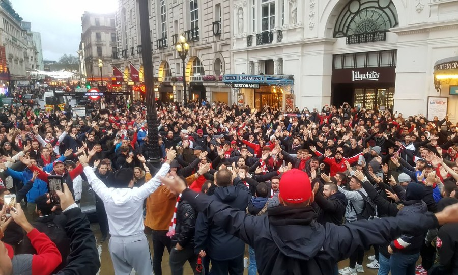 Οι οπαδοί των «ερυθρολεύκων» συγκεντρώθηκαν στη γνωστή πλατεία της βρετανικής πρωτεύουσας και από εκεί όλοι μαζί θα κατευθυνθούν στο γήπεδο των «σπιρουνιών», όπου θα παρακολουθήσουν την προσπάθεια της αγαπημένης τους ομάδας απέναντι στο συγκρότημα του Ζοσέ Μουρίνιο.