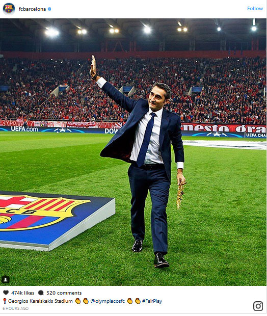 Ο πρώην προπονητής των «ερυθρολεύκων» γνώρισε την αποθέωση από τον κόσμο της ομάδας, τιμήθηκε από την ΠΑΕ Ολυμπιακός για την προσφορά του στον σύλλογο, υπήρχε κι ένα τεράστιο πανό που τον ευχαριστούσε για όλα και η Μπαρτσελόνα με τη σειρά της ευχαρίστησε την πειραϊκή ομάδα γι’ αυτή την συμπεριφορά «fair-play» που επέδειξε.