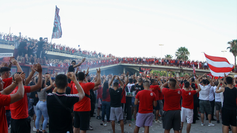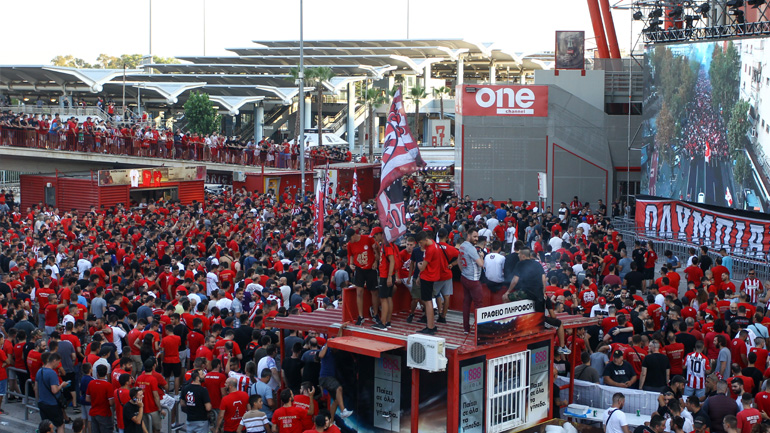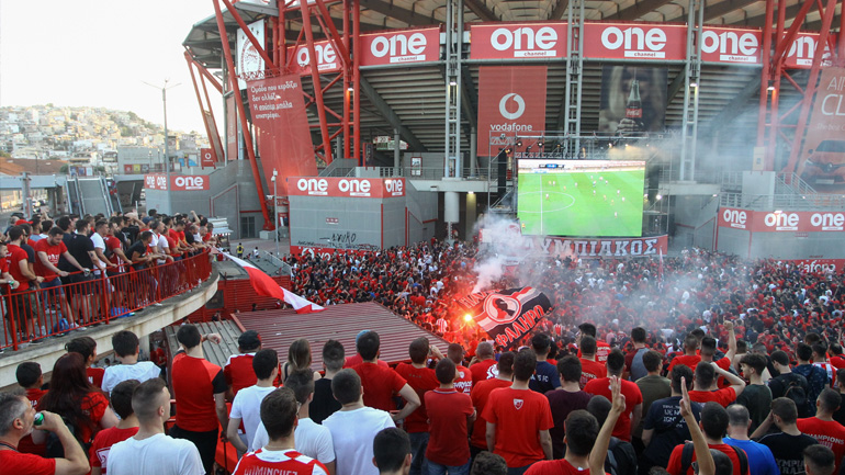 Οι φίλαθλοι των Πειραιωτών συγκεντρώθηκαν έξω από το φαληρικό γήπεδο για να παρακολουθήσουν σε προτζέκτορα την αναμέτρηση με την ΑΕΚ και να γιορτάσουν την επιστροφή της ομάδας τους στον «θρόνο» του ελληνικού ποδοσφαίρου.