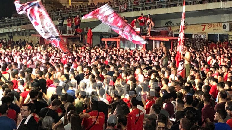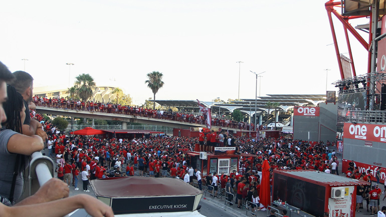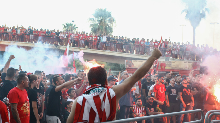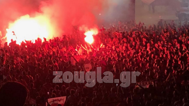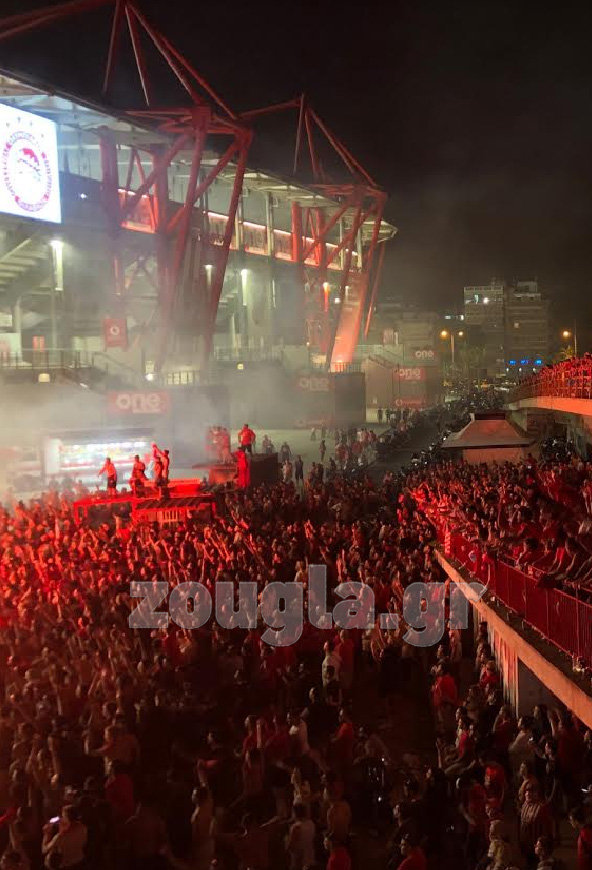 Xιλιάδες οπαδοί του Ολυμπιακού έχουν μαζευτεί έξω από το Γ. Καραϊσκάκης, αρχίζοντας από νωρίς το πάρτι για την κατάκτηση του 45ου πρωταθλήματος του της ομάδας.