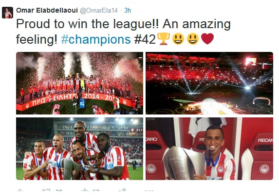 Την περηφάνια του για την κατάκτηση του πρώτου πρωταθλήματος της καριέρας του με τον Ολυμπιακό εξέφρασε, μέσω του λογαριασμού του στο twitter, ο Ομάρ Ελαμπντελαουί, κάνοντας λόγο για ένα απίστευτο συναίσθημα.