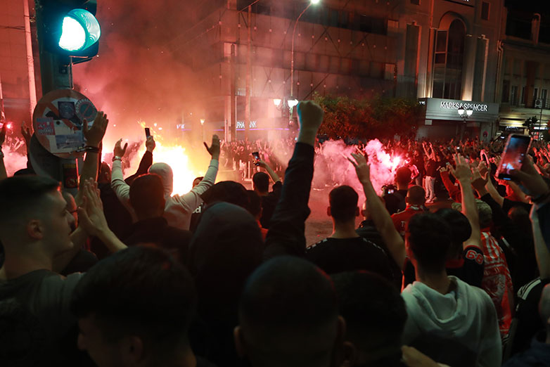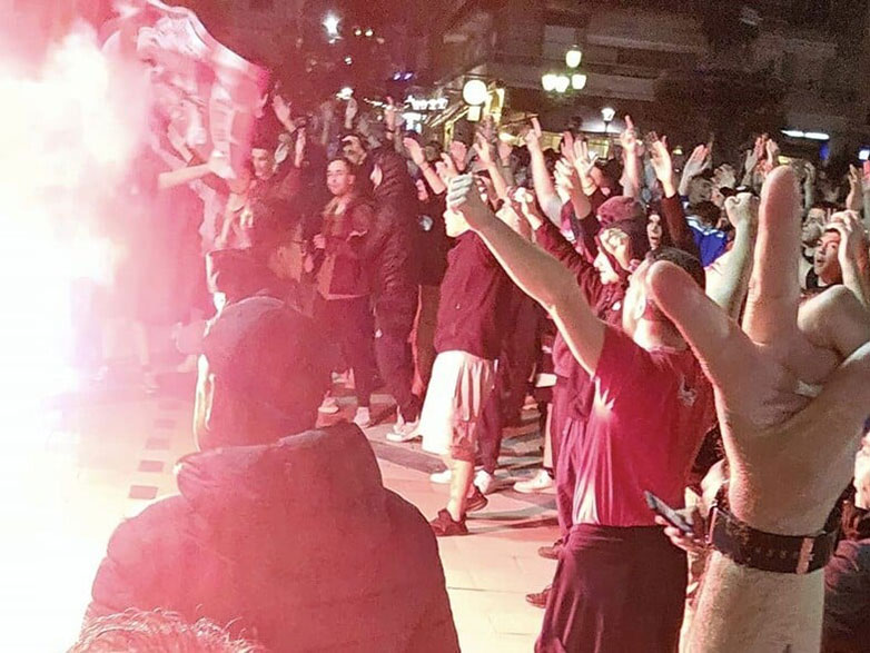 Εκατοντάδες φίλαθλοι πανηγύρισαν στο κέντρο του Βόλου για την πρόκριση του Ολυμπιακού στον τελικό του Europa Conference League.