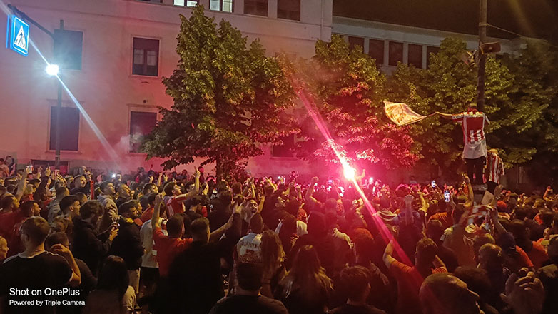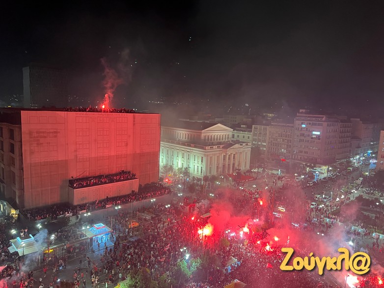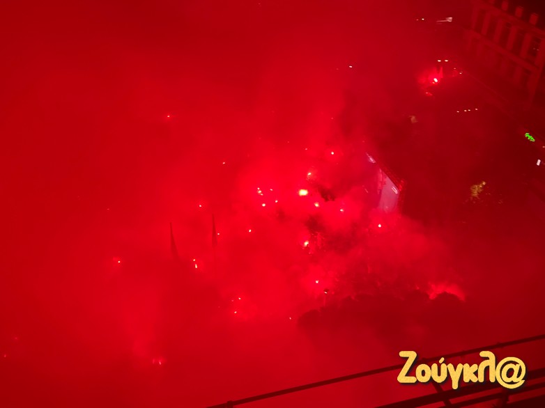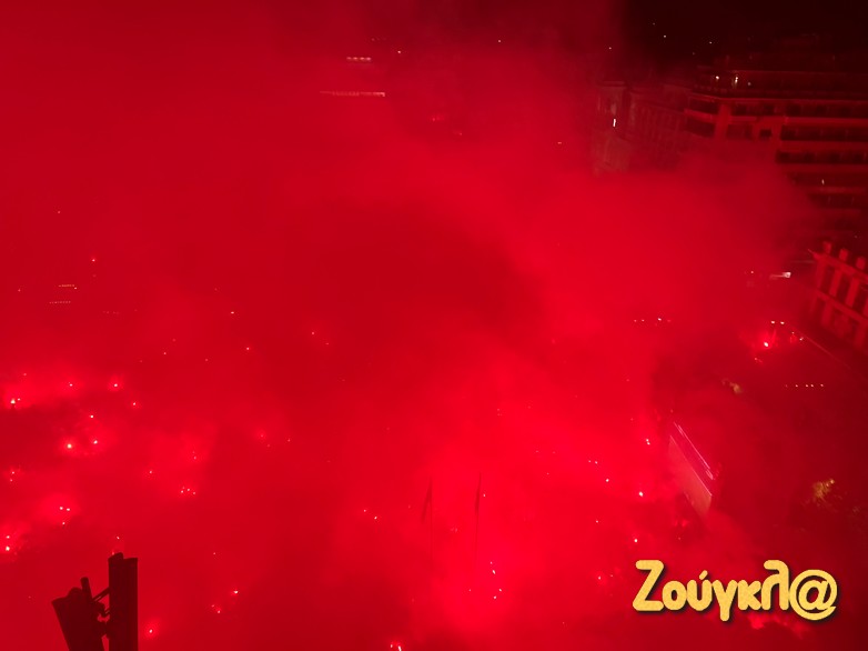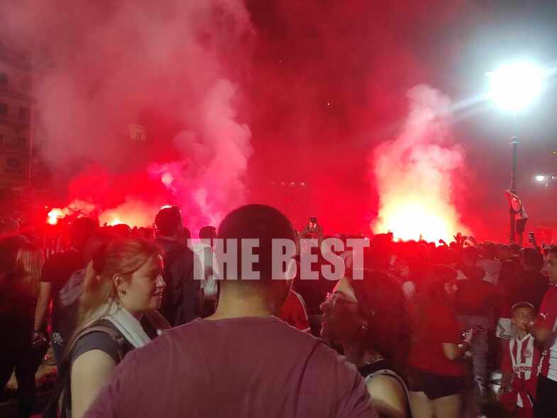 Εκεί στήθηκε ένα μεγάλο ερυθρόλευκο πάρτυ, με συνθήματα, σημαίες και πολλά βεγγαλικά, την ώρα που ο κόσμος ο οποιος είχε συγκεντρωθεί εκεί, δε σταμάτησε να λέει συνθήματα για τον κατακτητή Ολυμπιακό που οδήγησε την Ελλάδα στην κορυφή της Ευρώπης.