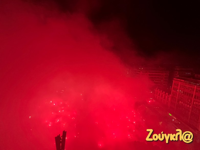 Δεκάδες βεγγαλικά και πυροτεχνήματα φώτισαν τον ουρανό ενώ οι οπαδοί δεν σταμάτησαν ούτε στιγμή να φωνάζουν συνθήματα.