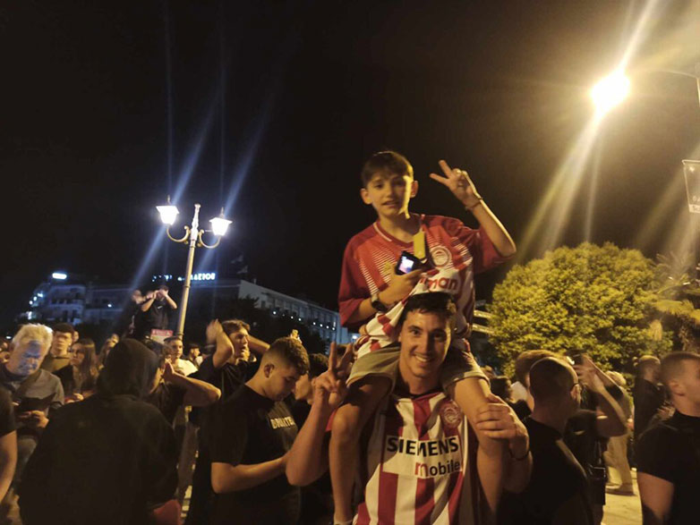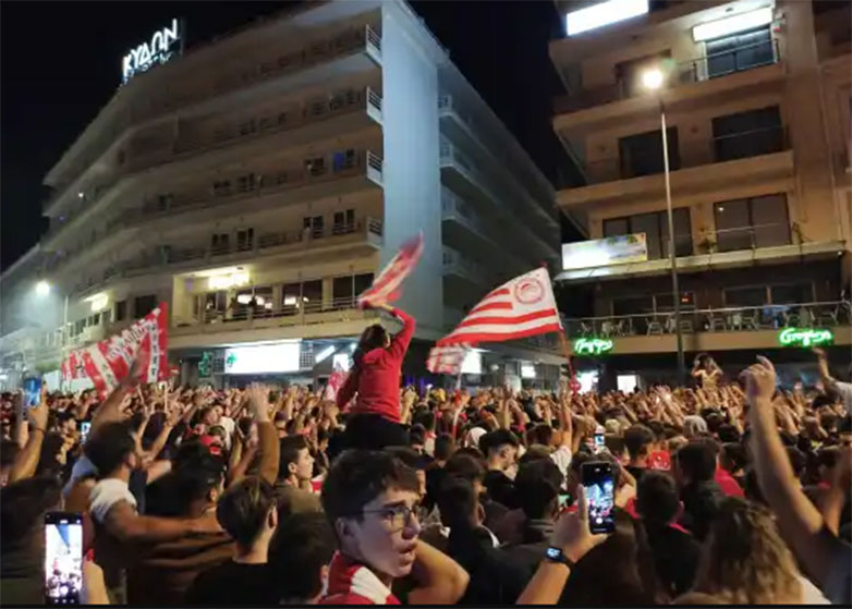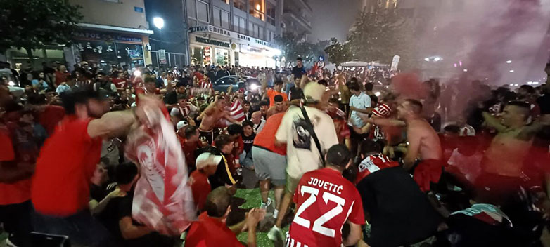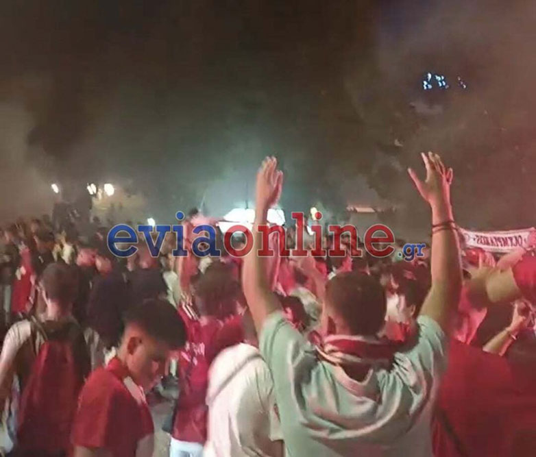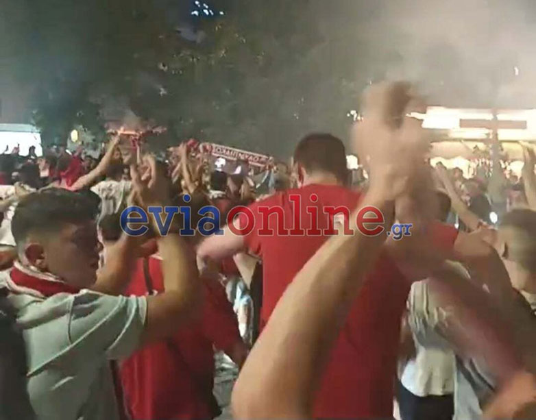 Μόλις σφύριξε ο Πορτογάλος διαιτητής την λήξη του τελικού οι φίλοι των ερυθρόλευκων που παρακολουθούσαν το παιχνίδι από τις οθόνες που είχαν στηθεί στα παραλιακά καταστήματα της Χαλκίδας ξέσπασαν σε ξέφρενους πανηγυρισμούς με την νύχτα να γίνεται ημέρα.
