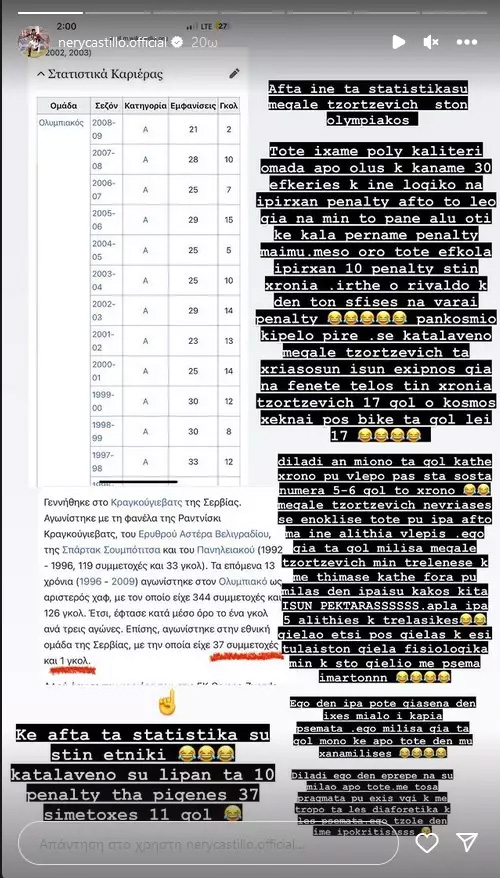 Στη συνέχεια, ο Καστίγιο ανέβασε στον λογαριασμό του στο Instagram τα στατιστικά με τις συμμετοχές και τα γκολ του Πρέντραγκ Τζόρτζεβιτς και συνέχισε την επίθεσή του: «Αυτά είναι τα στατιστικά σου μεγάλε Τζόρτζεβιτς στον Ολυμπιακό. Τότε είχαμε πολύ καλύτερη ομάδα απ’ όλους και κάναμε 30 ευκαιρίες. Λογικό να υπήρχαν πέναλτι. Αυτό το λέω για να μην το πάνε αλλού, ότι και καλά παίρναμε πέναλτι μαϊμού. Μέσο όρο τότε εύκολα υπήρχαν δέκα πέναλτι τη χρονιά. Ήρθε ο Ριβάλντο και δεν τον άφησες να βαράει πέναλτι. Παγκόσμιο Κύπελλο πήρε.
