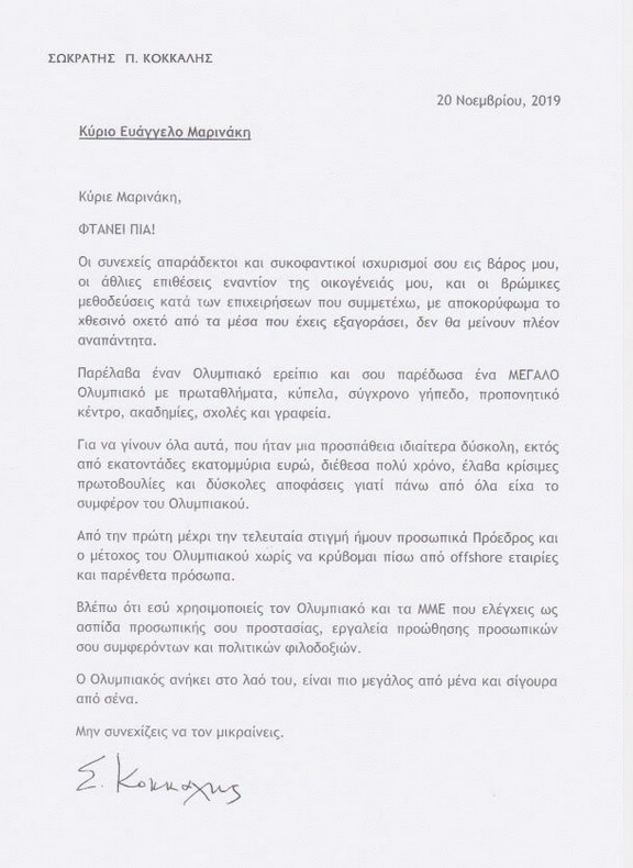 Μία ημέρα μετά από αυτό το γεγονός ο άλλοτε ισχυρός άνδρας του συλλόγου, Σωκράτης Κόκκαλης με προσωπική του επιστολή προς τον διάδοχό του στον ιδιοκτησιακό θώκο της ΠΑΕ, Βαγγέλη Μαρινάκη τον κατηγόρησε ότι χρησιμοποιεί τον Ολυμπιακό (όπως και τα ΜΜΕ που ελέγχει) για προσωπικά του συμφέροντα, ενώ, μεταξύ άλλων, τον κάλεσε να σταματήσει να μικραίνει την ομάδα.