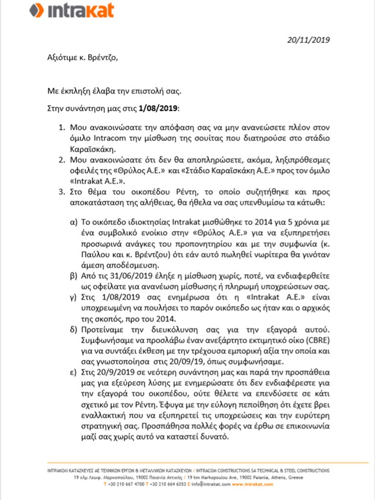 Εν τω μεταξύ η Intrakat με επιστολή που υπογράφει ο διευθύνων σύμβουλος της, Πέτρος Σουρέτης, προς τον Γιάννη Βρέντζο ο οποίος βρίσκεται στη διοίκηση του Ολυμπιακού, διευκρινίζει πτυχές της υπόθεσης για το οικόπεδο στου Ρέντη.